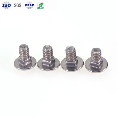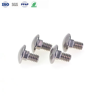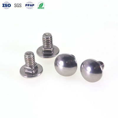 Parafuso decorativo de espelho com pescoço quadrado, feito de aço inoxidável com acabamento polido, ideal para fixações que requerem superfícies decorativas expostas em vagões de metro, banheiros, móveis,e aplicações similares.
